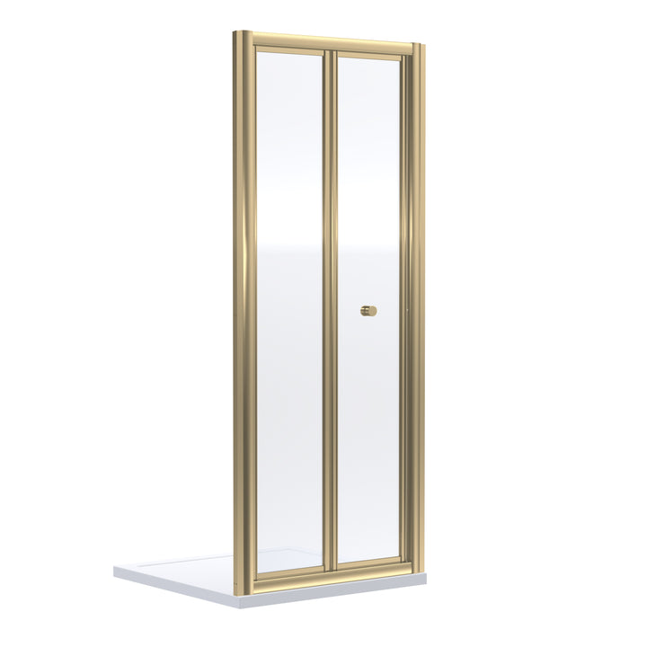 Brushed Brass frame. Reversible Bi-Fold door opens inwards to save space. 4mm toughened safety glass. Shower tray sold separately. Suitable for use within a recess, or with a side panel to make an enclosure. Round knob handles. All enclosures are back by a lifetime guarantee.